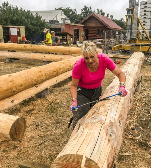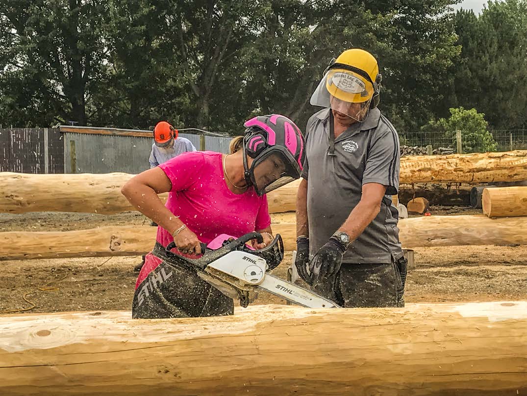 I quickly went out and purchased my chaps and chainsaws (with easy start) and had the fun of getting them painted sparkly pink. The paint shop staff did look amused at my request. With so many pink supplies, including my steel cap boots, none of the boys in the yard ever accidentally pick up my gear. My pink helmet was posted to me by Bryan Reid Sr from Pioneer Log Homes in Canada, after working with him on a job in Wanaka.