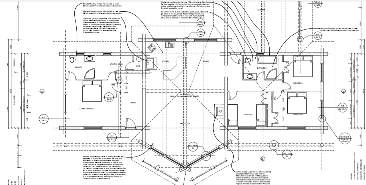 As you can see in the examples of plans below, log walls are drawn about 300mm thick and conventional walls are still drawn at 100mm, the log walls are always the structural walls, but you do not need foot thick handcrafted log walls around every wardrobe toilet cupboard etc. You can have as many log walls as you like, the Architects and engineers we use are very experienced in log home design and are able to provide you with a log home that best suits your needs your location your views etc.