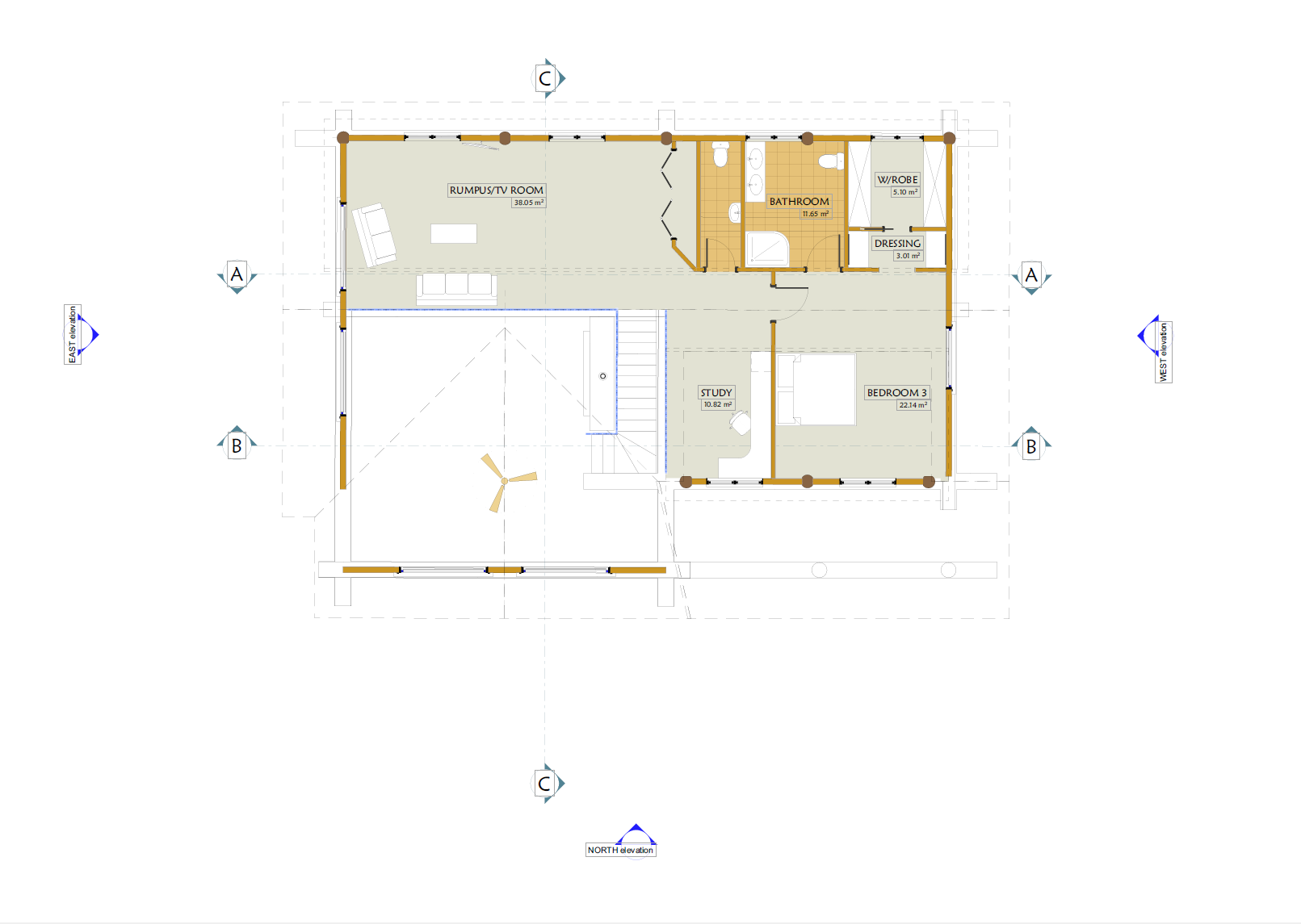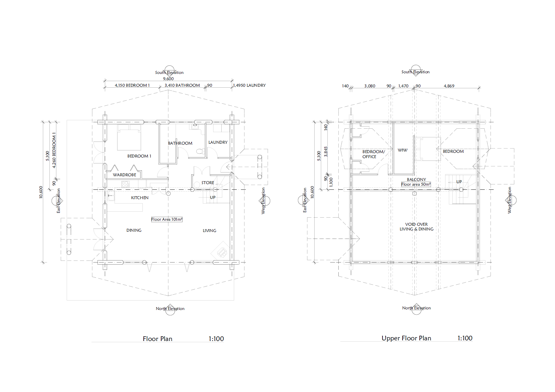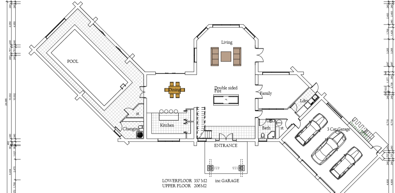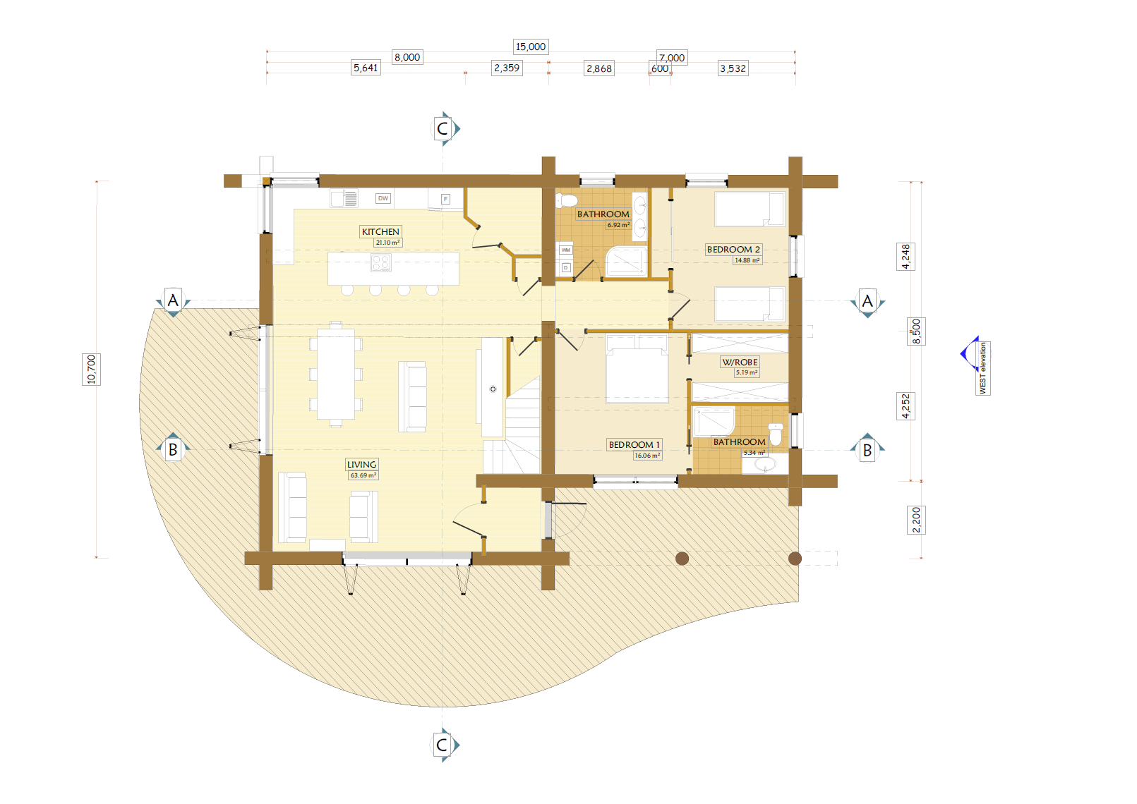 As you can see in the examples of plans below, log walls are drawn about 300mm thick and conventional walls are still drawn at 100mm, the log walls are always the structural walls, but you do not need foot thick handcrafted log walls around every wardrobe toilet cupboard etc. You can have as many log walls as you like, the Architects and engineers we use are very experienced in log home design and are able to provide you with a log home that best suits your needs your location your views etc.