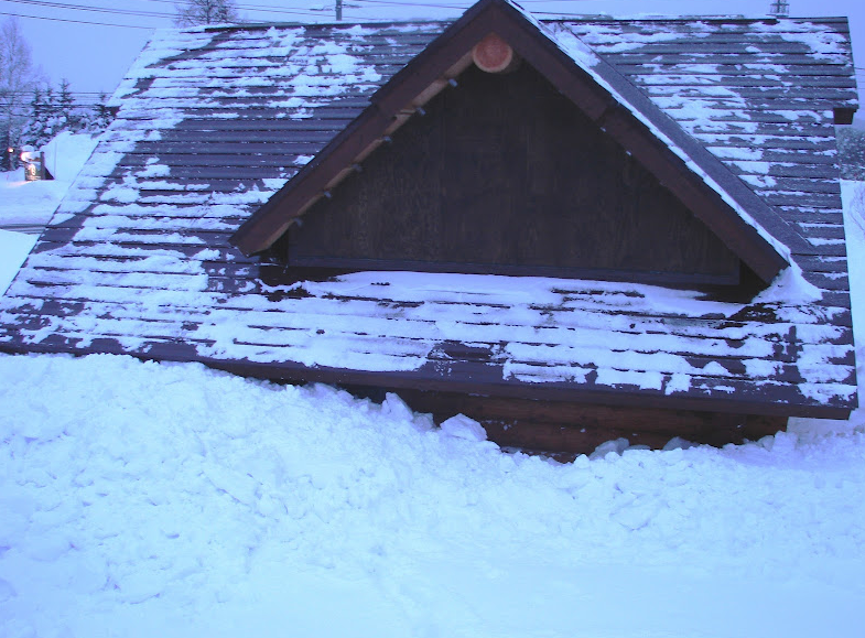 Picture above shows log cabin with an extention. Can you tell which part is original and which part is extention? January 2012.