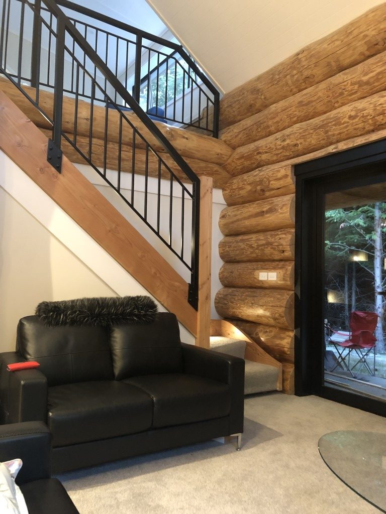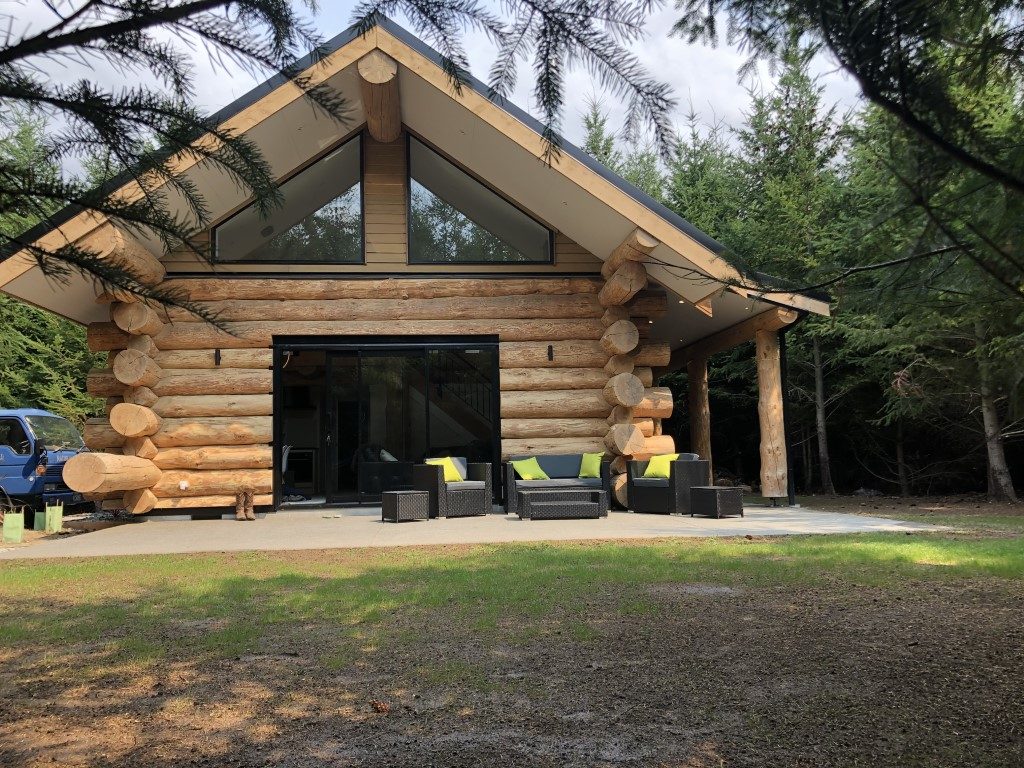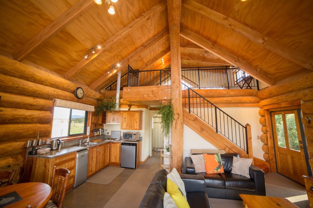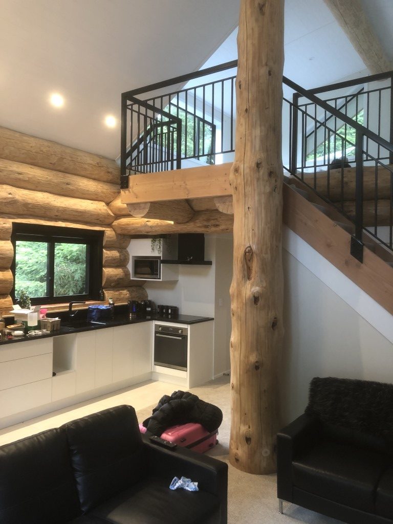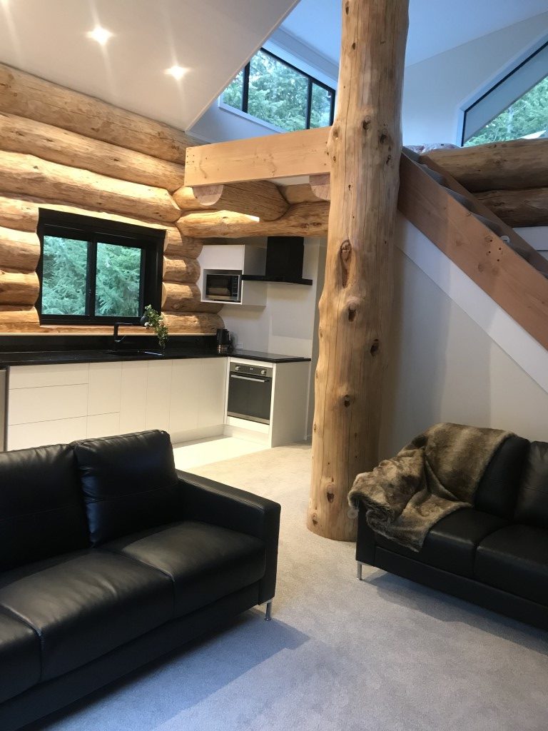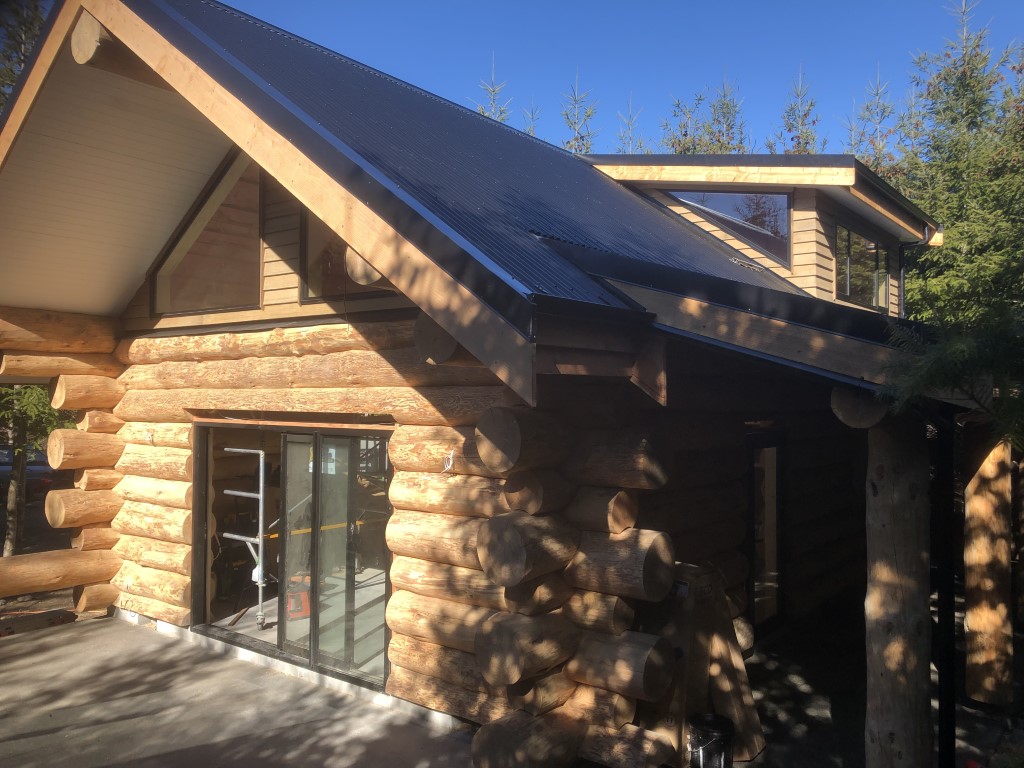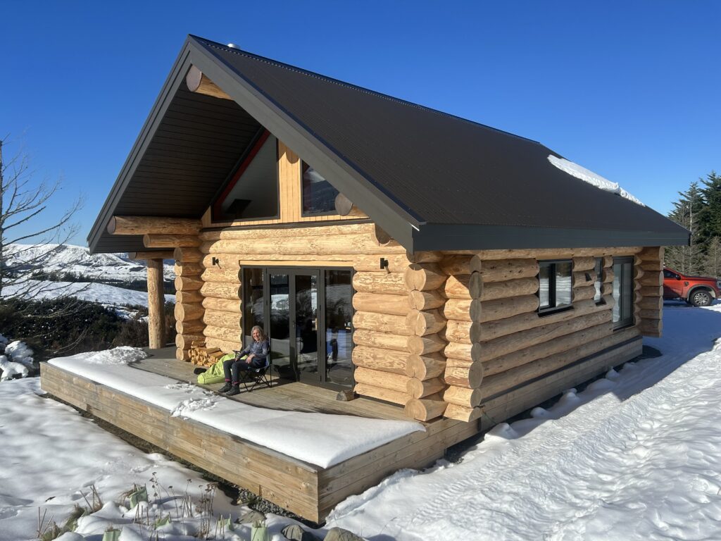 Fantail Cabin Twizel, our newest addition, 58 sq meters down 24 sqm up, 4 post log veranda, set in beautiful Douglas fir trees, two big shed dormers to optimize space upstairs, and a fantastic log center post. This cabin has been a fantastic journey for Christine who attended a log building course so she could work on building her own Log cabin, she peeled logs ,she selected each for the walls, she scribed and cut logs, the roof is now on and the door and windows soon. Watch this space. All done, carpet is down, we have stayed some nights and love it, warm cozy with a modern appeal,