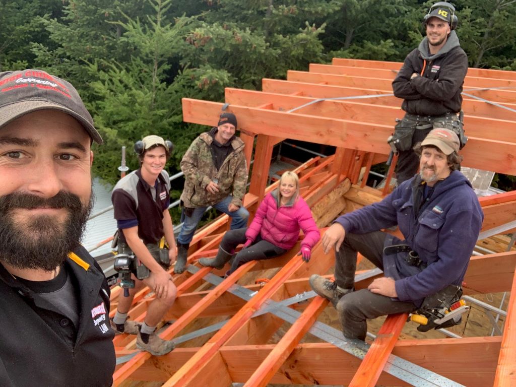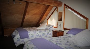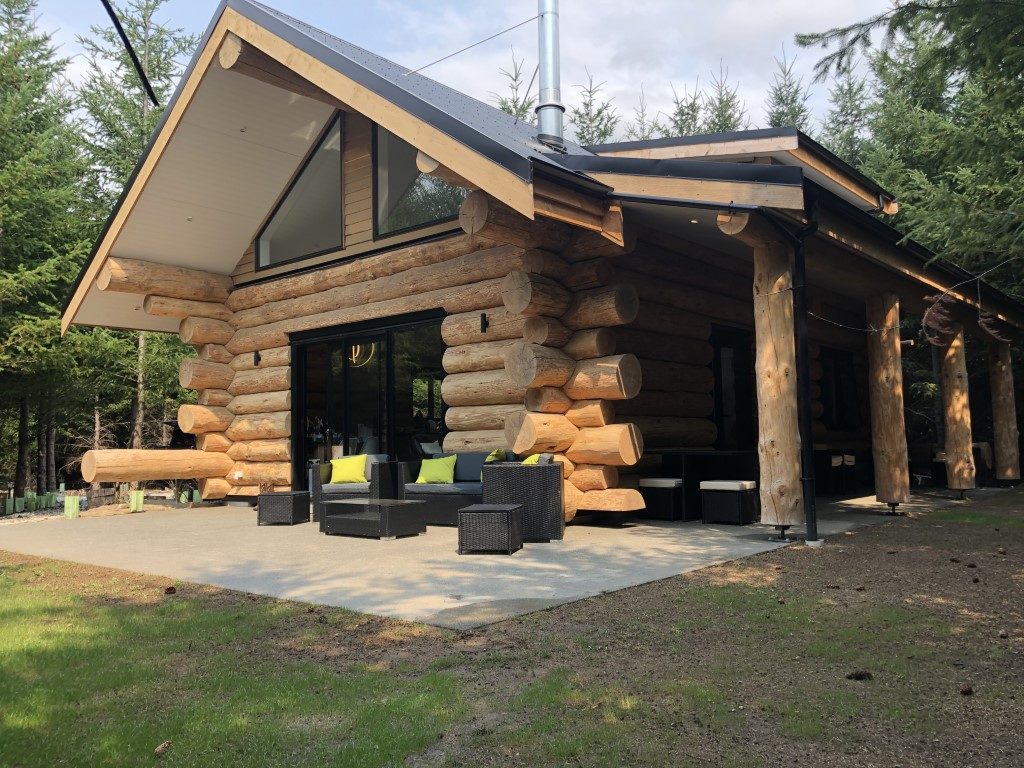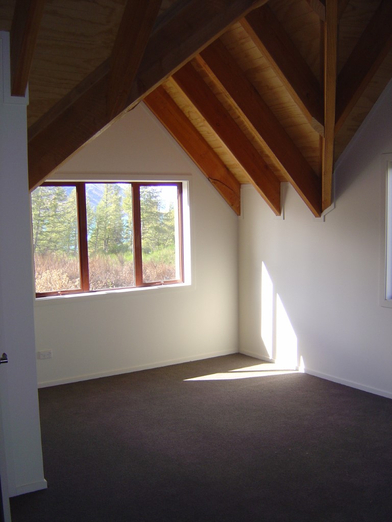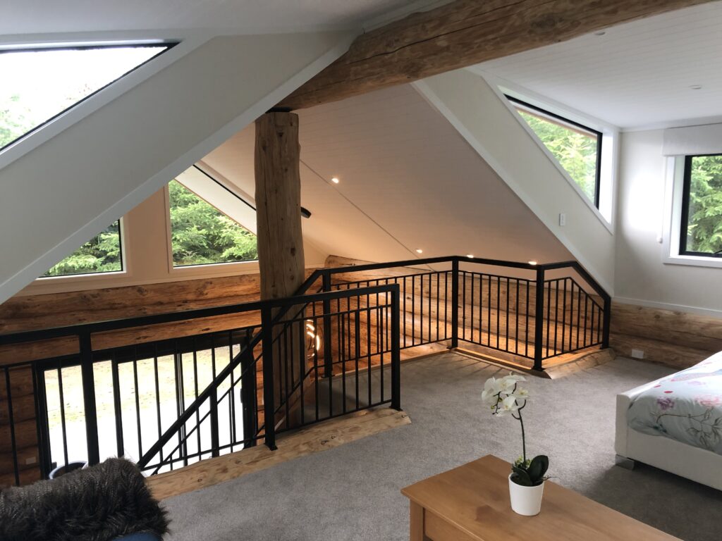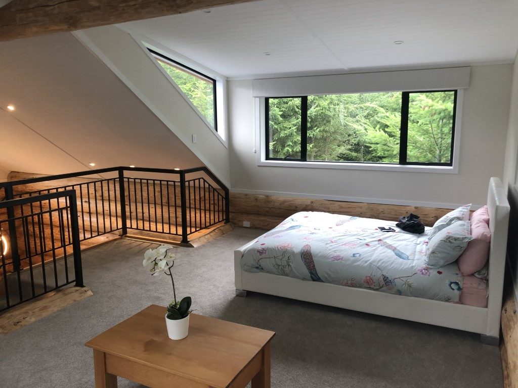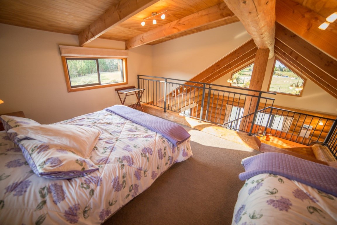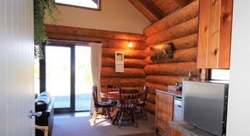 Fantail Cabin Twizel, our newest addition, 58 sq meters down 24 sqm up, 4 post log veranda, set in beautiful Douglas fir trees, two big shed dormers to optimize space upstairs, and a fantastic log center post. This cabin has been a fantastic journey for Christine who attended a log building course so she could work on building her own Log cabin, she peeled logs ,she selected each for the walls, she scribed and cut logs, the roof is now on and the door and windows soon. Watch this space. All done, carpet is down, we have stayed some nights and love it, warm cozy with a modern appeal,