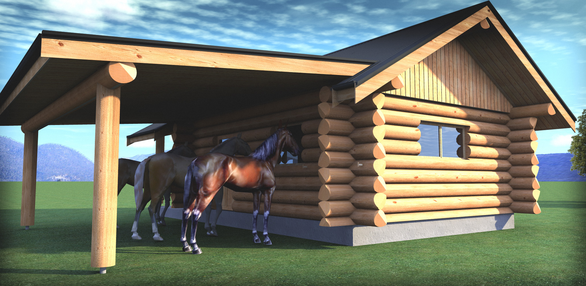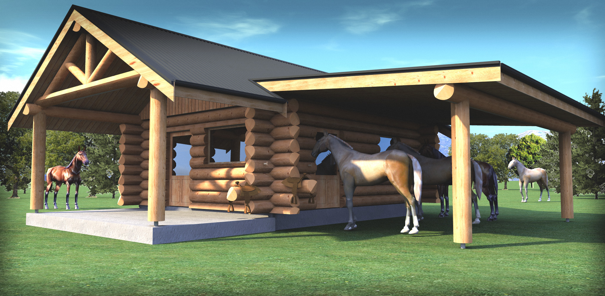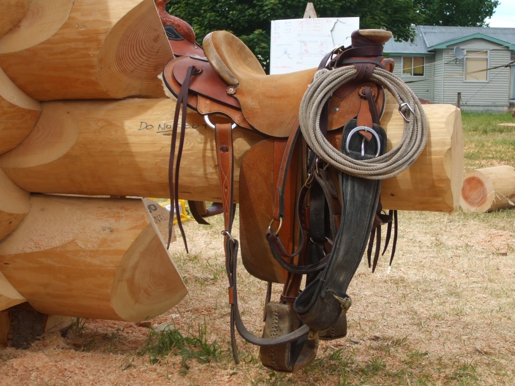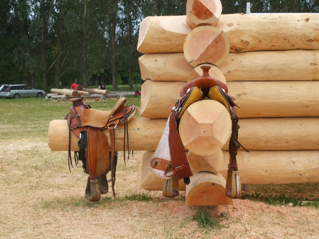 Ive now built two log tack rooms, we can add an awesome feature to the outside corners of tack rooms where we purposely extend a lower wall log out to take one or two saddles, believe me I know its great to just slide that saddle off to a convenient saddle stand, (we make these also)